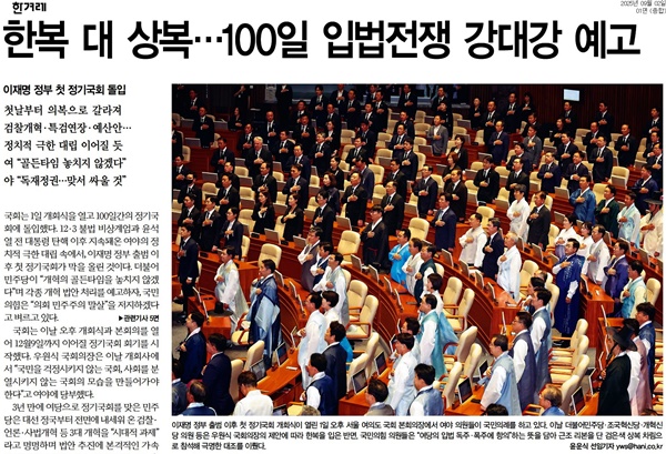 정기국회 개회식에서 국민의힘 의원들은 “여당의 입법 독주·폭주에 항의”라는 뜻을 담아 근조 리본을 단 검은색 상복 차림으로 참석했다. 한겨레는 1면 톱기사 <한복 대 상복…100일 입법전쟁 강대강 예고>에서 “3년 만에 여당으로 정기국회를 맞은 민주당은 대선 정국부터 전면에 내세워 온 검찰·언론·사법개혁 등 3대 개혁을 ‘시대적 과제’라고 명명하며 법안 추진에 본격적인 가속 페달을 밟고 있다”고 전한 뒤 “대선 패배 이후 야당이 된 국민의힘은 이재명 정부를 ‘독재 정권’으로 부르며 건건이 맞설 것을 예고하고 있다”고 보도했다.