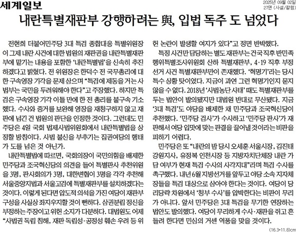 세계일보도 사설 <내란특별재판부 강행하려는 與, 입법 독주 도 넘었다>에서 “내란특별법에 따르면 국회의장이 국민의힘을 배제한 민주당과 조국혁신당의 의견을 들어 특별판사 추천위원을 3명, 판사회의가 3명, 대한변협이 3명을 각각 추천해 서울중앙지법과 서울고검에 특별재판부를 설치하겠다는 것”이라며 “이렇게 된다면 압도적 의석을 가진 여당이 재판부 구성을 사실상 좌지우지할 것이 뻔하다”고 우려했다.