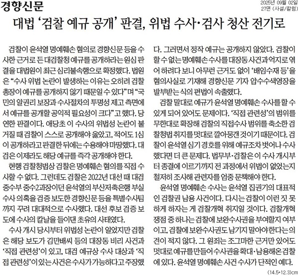 경향신문은 사설 <대법 ‘검찰 예규 공개’ 판결, 위법 수사·검사 청산 전기로>에서 “애당초 이 수사의 위법성 논란이 불거질 때 검찰이 스스로 (예규를) 공개해야 옳았고, 적어도 1심이 공개하라고 판결한 뒤에는 수용해야 마땅했다”며 “대검은 이제라도 해당 예규를 즉각 공개해야 한다”고 주장했다. 검찰은 대검 예규상 이 사건이 김만배씨 등의 대장동 비리 사건과 ‘직접 관련성’이 있어 수사가 가능하다고 주장했지만 해당 예규는 공개하지 않고 있다.