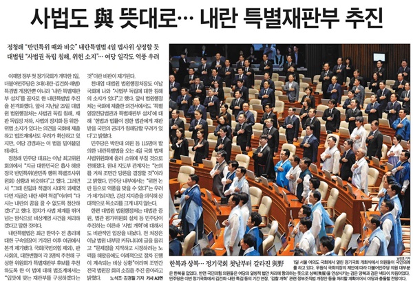 조선일보도 1면에 한복과 상복을 입은 국회의원들 사진을 실었다. 그러면서 이 신문은 민주당 비판에 무게를 뒀다. 1면 톱기사 <사법도 與 뜻대로…내란 특별재판부 추진>에서 “민주당이 ‘내란 특별재판부 설치’를 골자로 한 내란특별법 추진을 본격화했다”며 “앞서 지난달 29일 대법원 법원행정처는 사법권 독립 침해, 재판 독립성 저하, 사법의 정치화 등 위헌·위법 소지가 있다는 의견을 국회에 제출하고 법조계에서도 우려가 확산되고 있지만 여당 강경파는 이 법을 밀어붙일 태세”라고 비판했다.