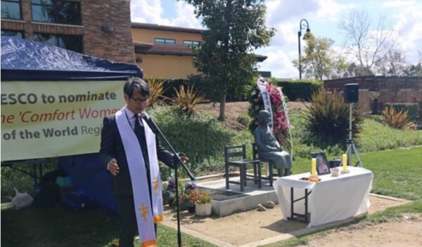 2019년 3월 9일 세계여성의 날을 맞아 캘리포니아 클렌데일 평화의 소녀상 앞에서 위안부 피해자 고 곽예남 할머니 추도 기도를 하는 모습. 2025.09.20. 사진제공 최재영 목사