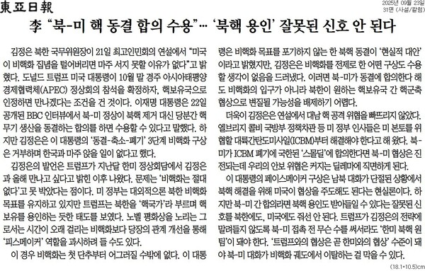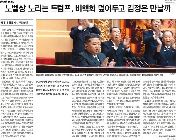 김정은 북한 국무위원장이 비핵화를 목표로 하지 않는다면 도널드 트럼프 미국 대통령과 만날 수 있다고 밝혔다. 2기 트럼프 행정부 들어 처음 대미 전략 방침을 공개 연설로 거론했다. 23일 신문들은 1면에 이 소식을 올려 10월 말 북미 정상 회동 가능성을 내다봤다. 사설에선 이재명 대통령이 밝힌 ‘현실적 대안으로서의 핵개발 동결’에 전망을 내놨다.