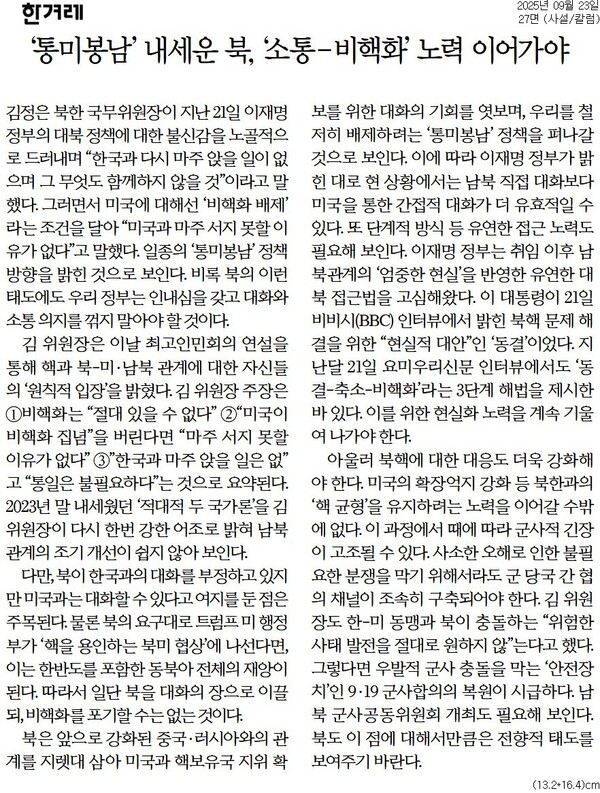 한겨레는 사설에선 “북의 이런 태도에도 우리 정부는 인내심을 갖고 대화와 소통 의지를 꺾지 말아야 할 것”이라며 “북은 앞으로 강화된 중국·러시아와의 관계를 지렛대 삼아 미국과 핵보유국 지위 확보를 위한 대화의 기회를 엿보며, 우리를 철저히 배제하려는 ‘통미봉남’ 정책을 펴나갈 것으로 보인다. 이에 따라 이재명 정부가 밝힌 대로 현 상황에서는 남북 직접 대화보다 미국을 통한 간접적 대화가 더 유효적일 수 있다”고 했다.