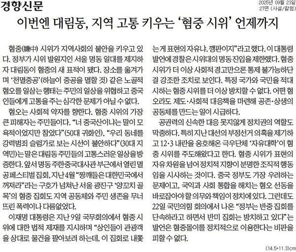 경향신문은 관련 사설을 내고 “(혐중 시위가) 주민의 일상을 위협하고 중국인들에게 고통을 주는 심각한 문제”라고 지적했다. “제도·사회적 대응책”이 시급하고, “정치권 역할도 막중하다”고 했다. 특히 지난 대선 부정선거 의혹을 제기하고 12·3 내란을 옹호하는 극우단체 ‘자유대학’이 혐중 시위를 주도한 점을 두고 “혐중 시위가 표현의 자유 차원을 넘어 정치적 지향이 분명한 조직적 행동임을 시사”한다고 했다. 이 와중 지난 22일 국민의힘 회의에선 “정부는 반중 집회를 단속하라고 하면서 반미 집회는 방치하고 있다”는 발언이 나왔다며 “혐중몰이를 정치적으로 이용한다는 비판을 피할 수 없다”고 밝혔다.