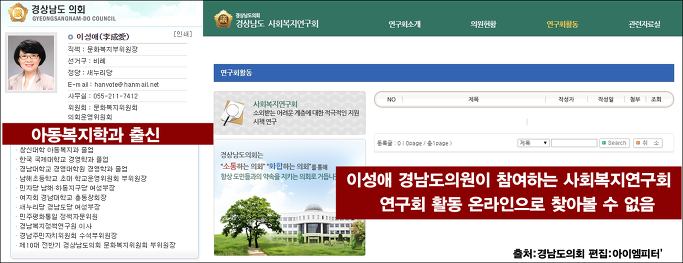 이성애 경남도의원이 참여하고 있는 경남도의회 사회복지연구회의 홈페이지를 보면 활동 내역이나 자료를 찾아볼 수가 없습니다. 평소에 소외당하거나 어려운 계층에 대한 공부를 게을리했으니 당연히 막말이 나왔다고 봐야 할 정도입니다.