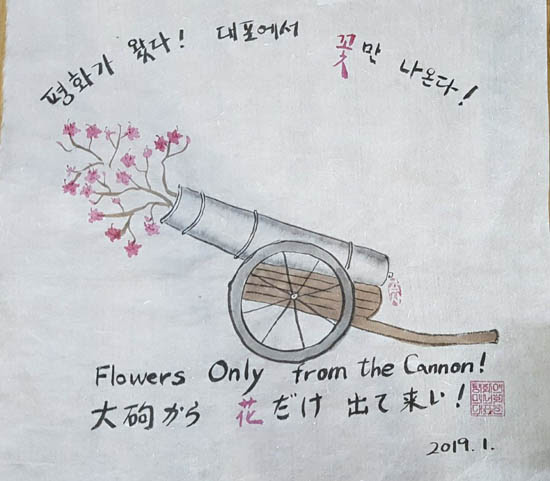 군사주의를 끝내라! 평화가 왔다, 무기는 가라! 평화가 왔다, 전쟁은 없다! 평화가 왔다, 군대는 필요 없다! 무기를 버리고, 대화로 해결하라! 코리아와 아시아에 평화가 왔다! 대포에서 꽃만 나온다!