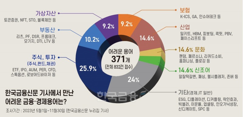 분야별로 보면 ETF, 배당, IPO, 유가증권 등 주식 관련 용어가 가장 많았고 이어 부동산 용어(리츠, PF, DSR, 프롭테크), 코인 분야 용어(블록체인, 토큰증권, NFT, STO 등) 등이 많았습니다. 이밖에도 보험, 펀드, 채권 관련 용어 등을 질문하는 독자들이 많았습니다.